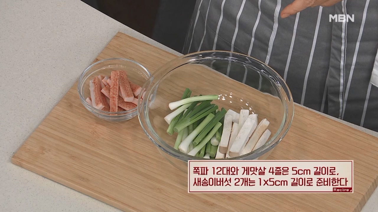 6. 쪽파 12대와 게맛살 4줄은 5cm 길이로 자르고 새송이버섯 2개는 1x5cm 길이로 잘라 준비합니다.