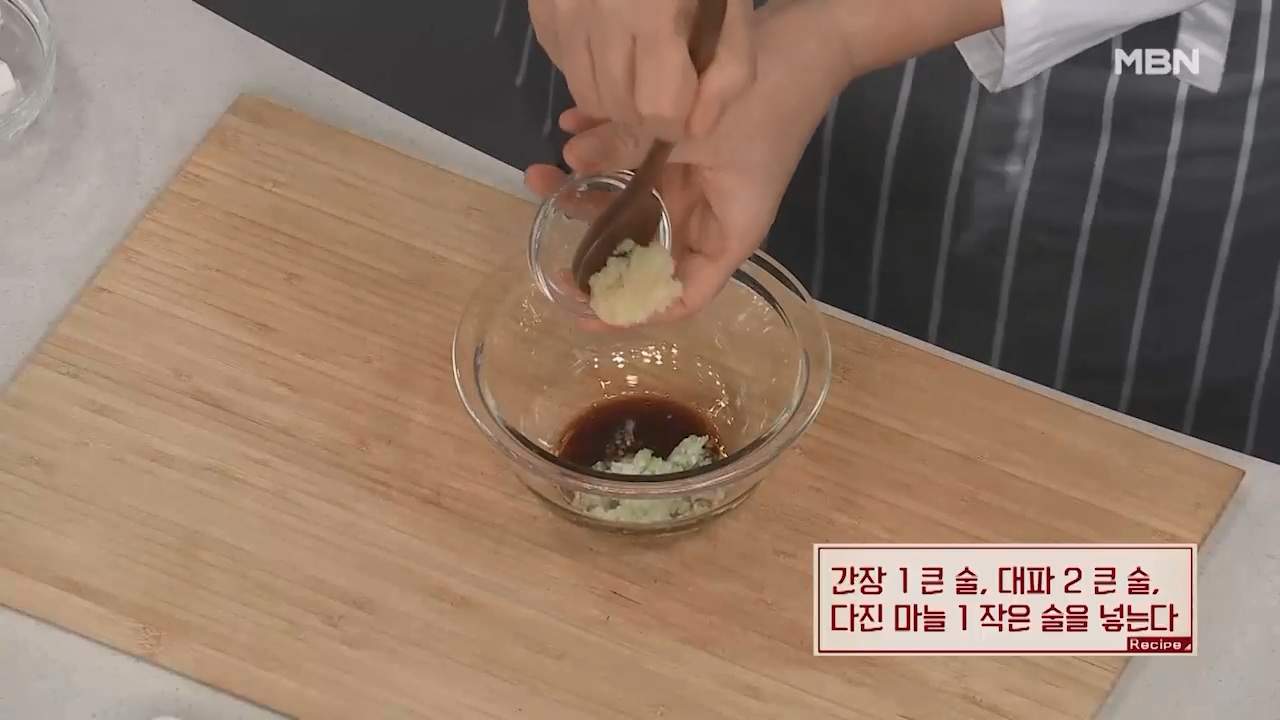 2. 그릇에 간장 1큰술, 대파 2큰술, 다진마늘 1작은술을 넣습니다.