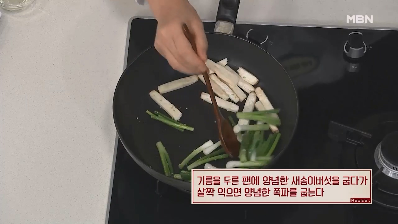 8. 기름을 두른 팬에 양념한 새송이버섯을 굽다가 살짝 익으면 양념한 쪽파를 굽습니다.