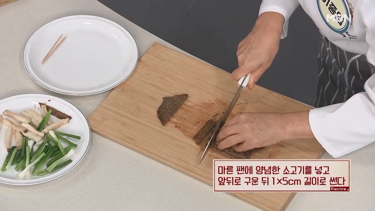 9. 마른 팬에 양념한 소고기를 넣고 앞뒤로 구운 뒤 1 x 5cm 길이로 썰어줍니다.