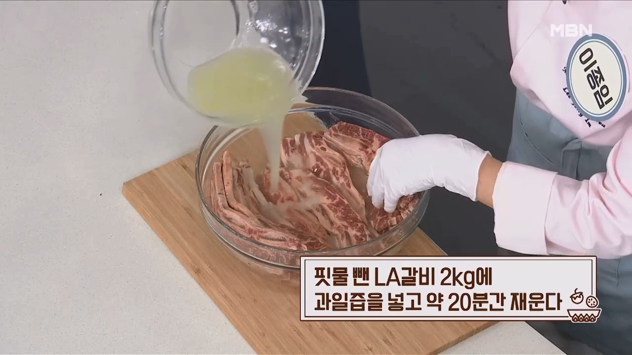 5. 핏물 뺀 LA갈비 2kg에 과일즙을 넣고 약 20분간 재웁니다.