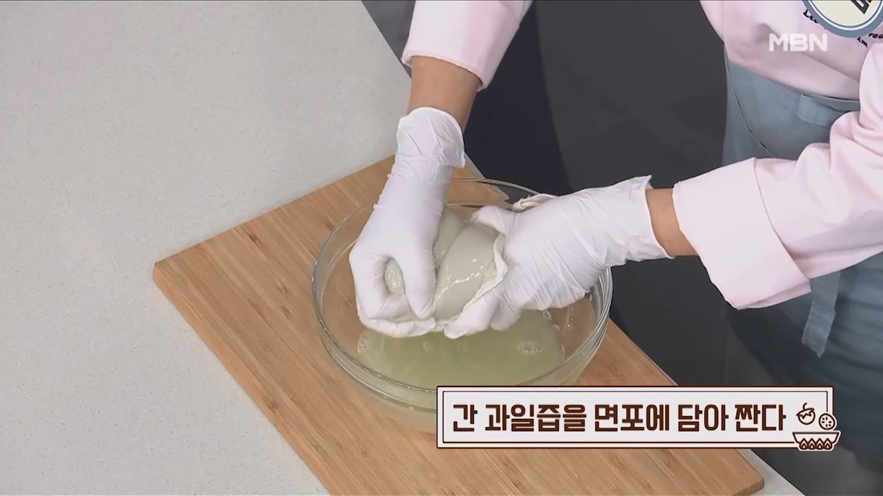 4. 믹서기에 간 과일즙을 면포에 담아 꽉 짭니다.