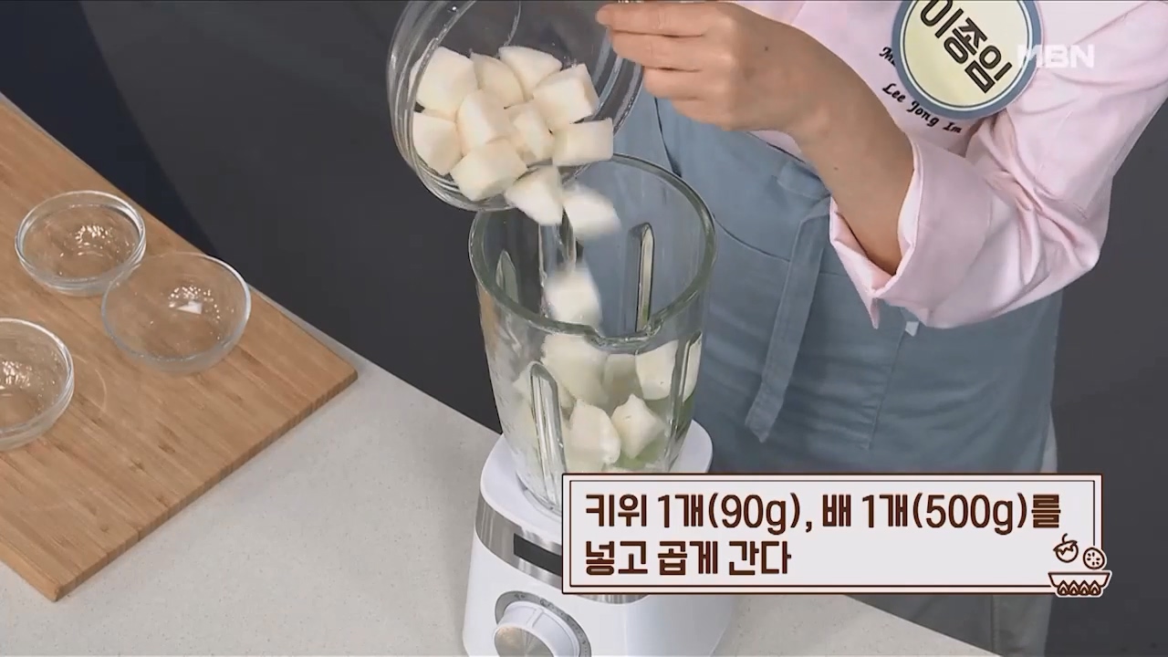 3. 키위 1개(90g), 배 1개(500g)를 넣고 곱게 갈아줍니다.