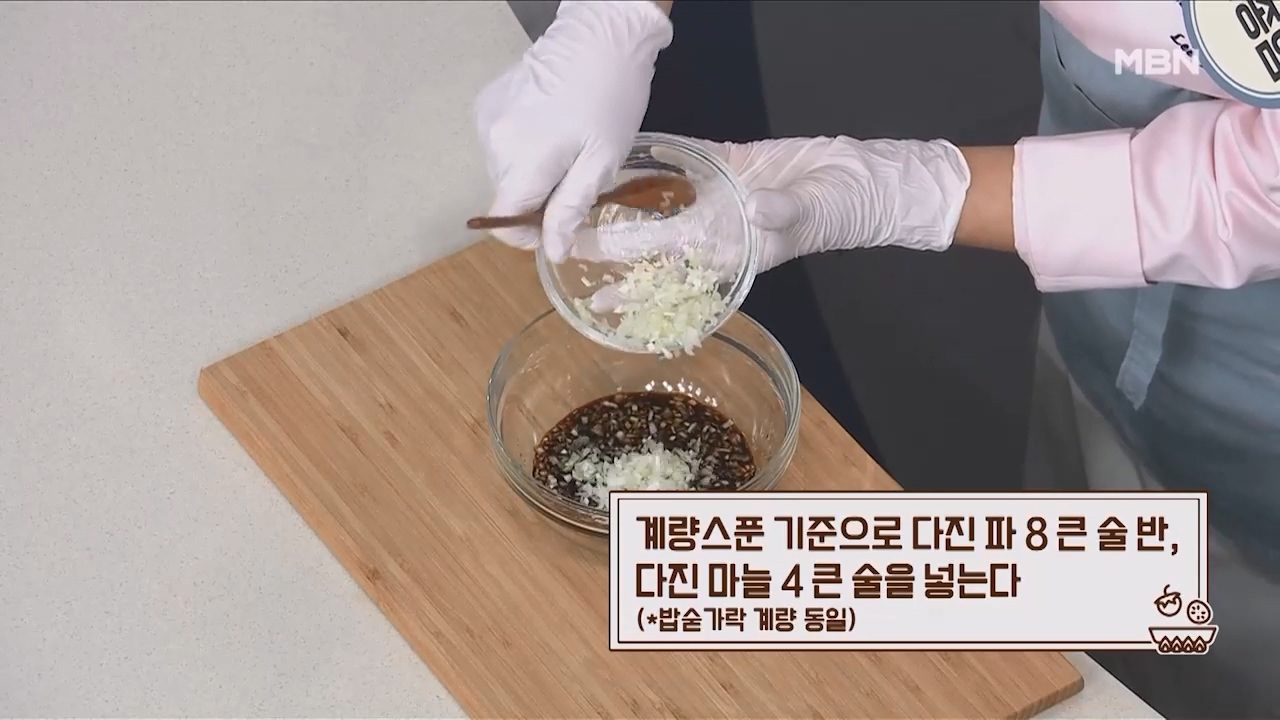 7. 계량스푼 기준으로 다진 파 8큰술 반, 다진 마늘 4큰술을 넣습니다. (밥숟가락 계량 동일)