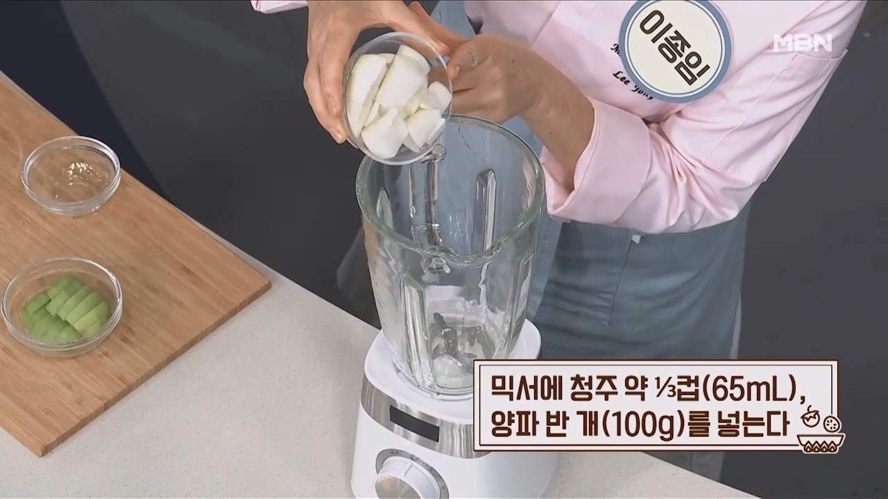 2. 믹서기에 청주 약 1/3컵(65mL), 양파 반개(100g)를 넣습니다.