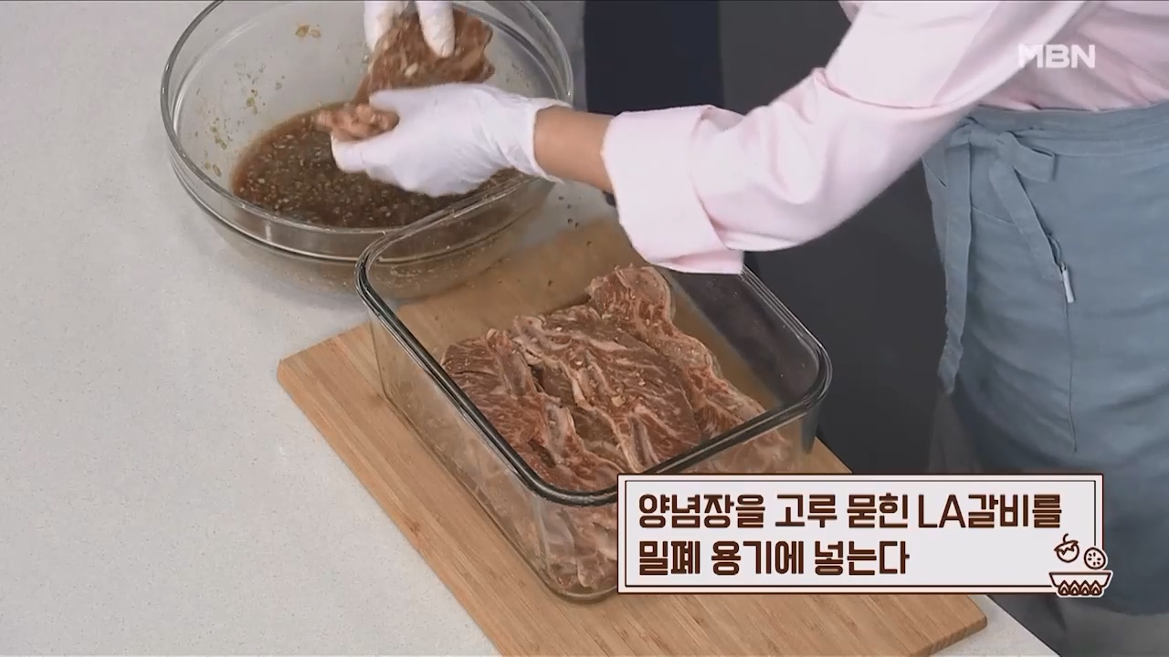 15. 양념장을 고루 묻힌 LA갈비를 밀폐용기에 넣습니다.
