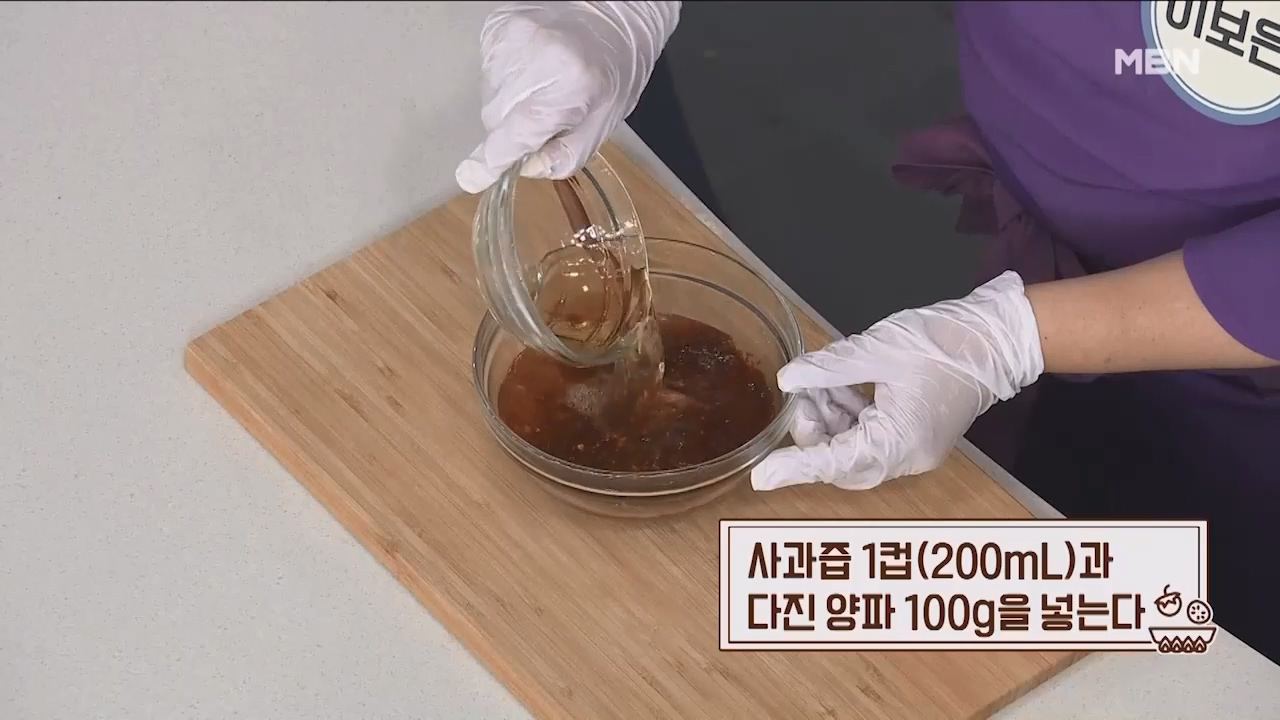 8. 사과즙 1컵(200mL)과 다진 양파 100g을 넣습니다.