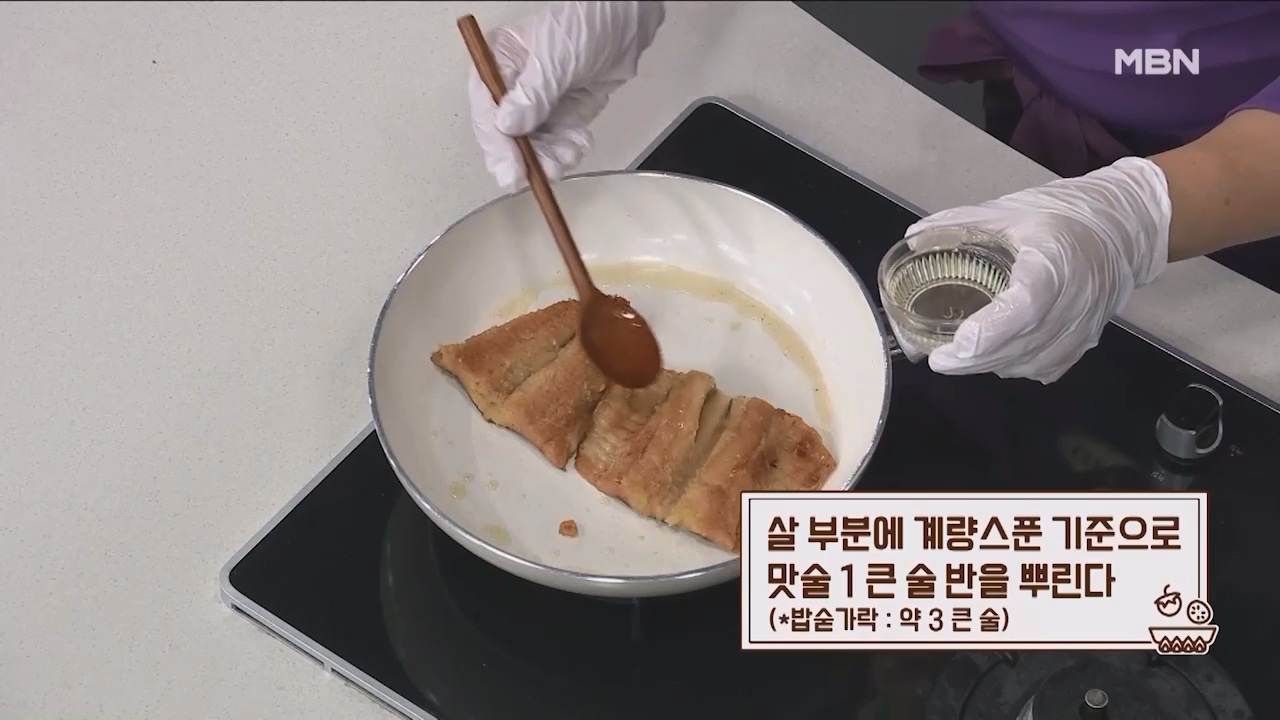 15. 북어 살 부분에 계량스푼 기준으로 맛술 1큰술 반을 뿌립니다. (밥숟가락 약 3큰술)