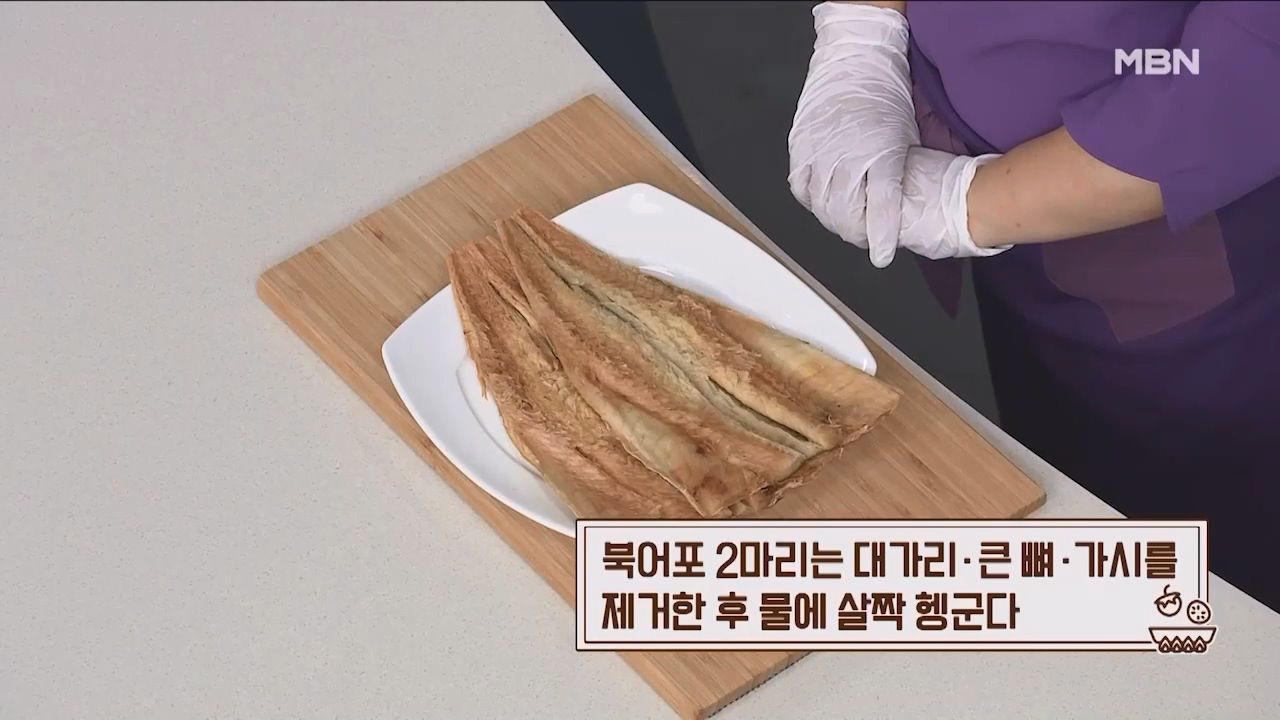 1. 북어포 2마리는 북어 대가리, 큰벼, 가시를 제거한 후 물에 살짝 헹궈줍니다.
