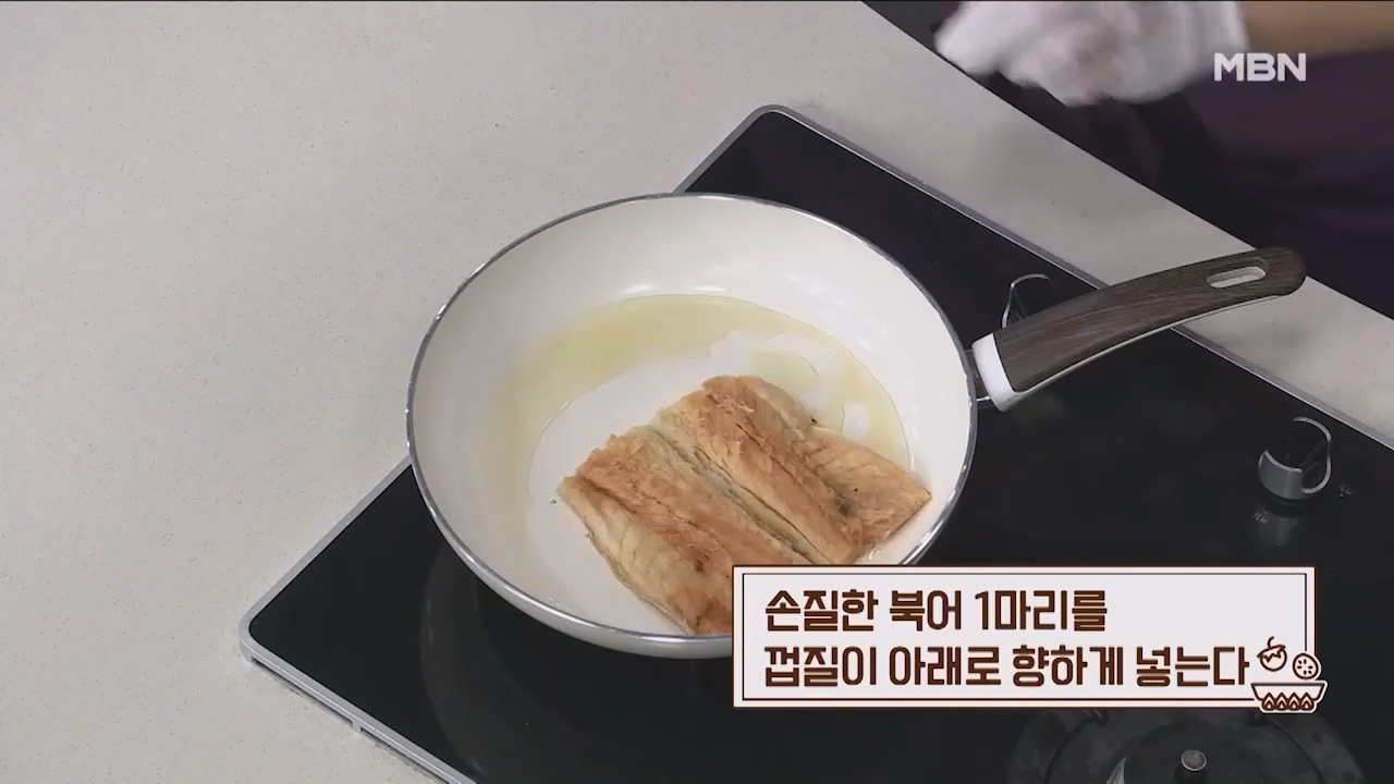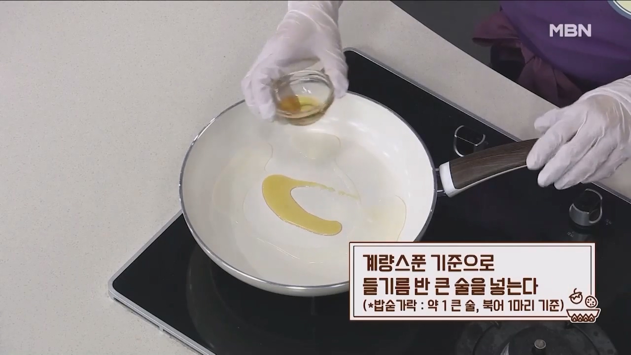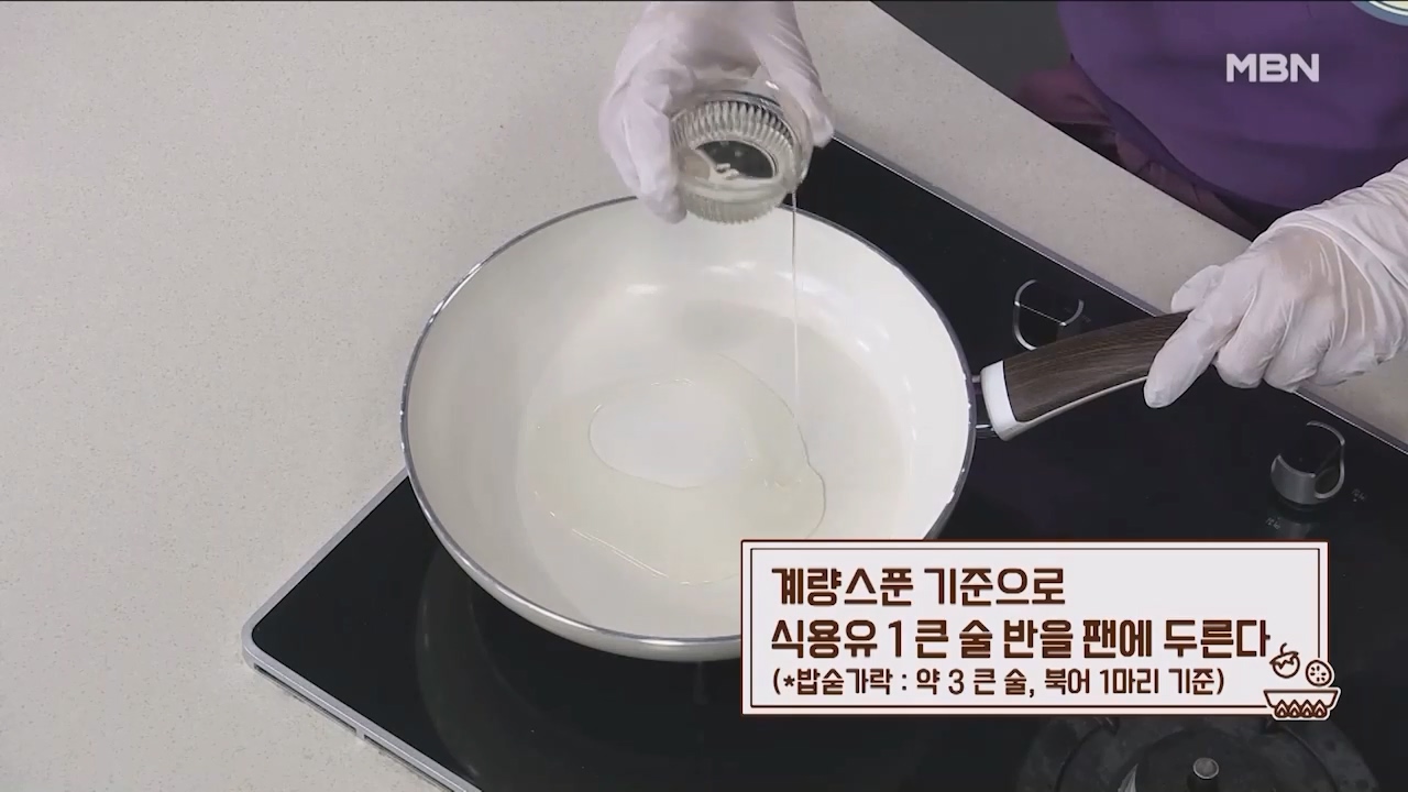 11. 계량스푼 기준으로 식용유 1큰술 반을 팬에 두릅니다. (밥숟가락 약 3큰술, 북어 1마리 기준)