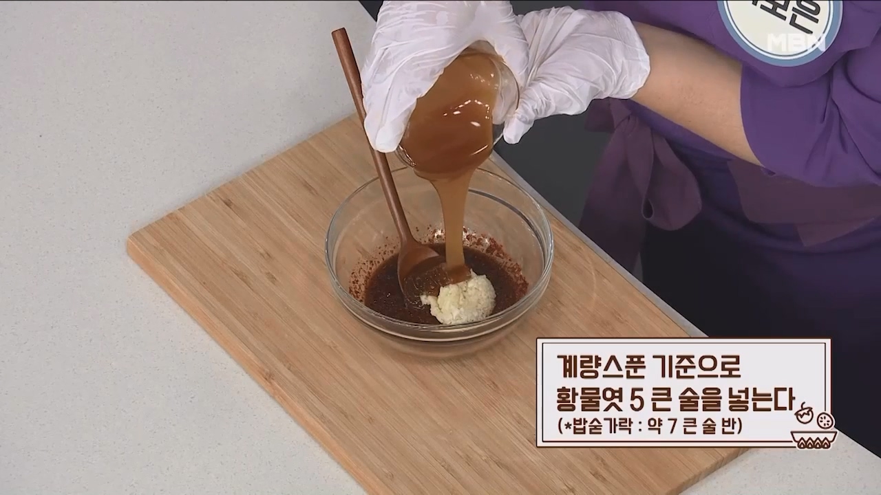 7. 계량스푼 기준으로 황물엿 5큰술을 넣습니다. (밥숟가락 약 7큰술반)