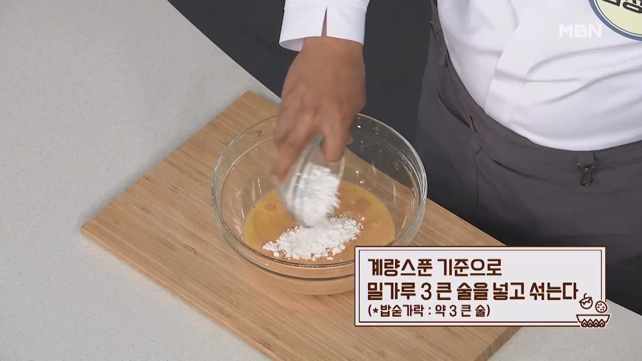 4. 계량스푼 기준으로 밀가루 3큰술을 넣고 잘 섞어줍니다.