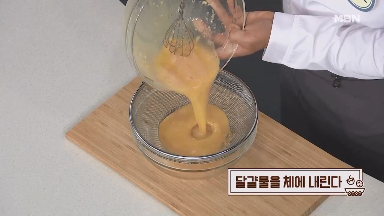 5. 달걀물을 체에 내립니다.