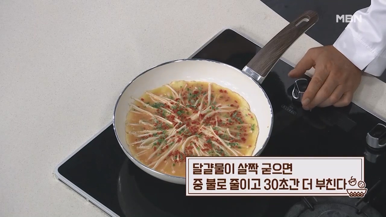 12. 전을 뒤집고 30초 후에 불을 끈 뒤 잔열로 팽이버섯전을 익혀줍니다.