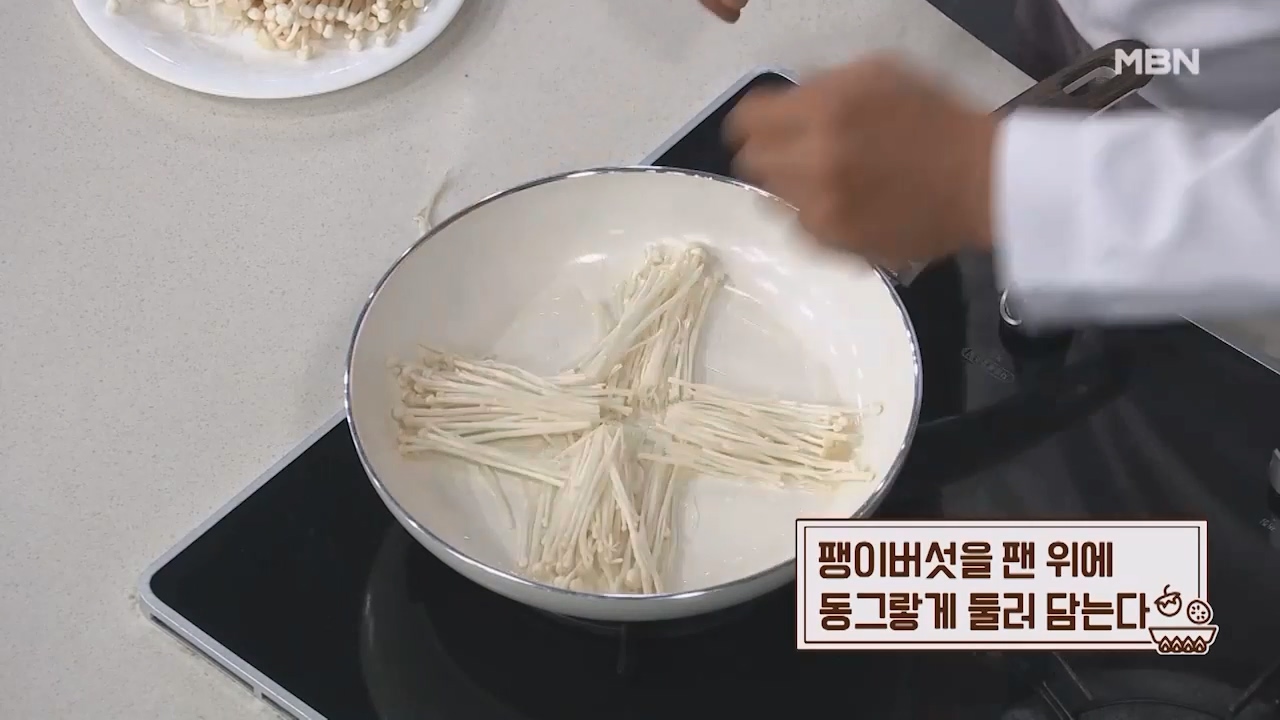 8. 팽이버섯을 팬 위에 동그랗게 둘러 담습니다.