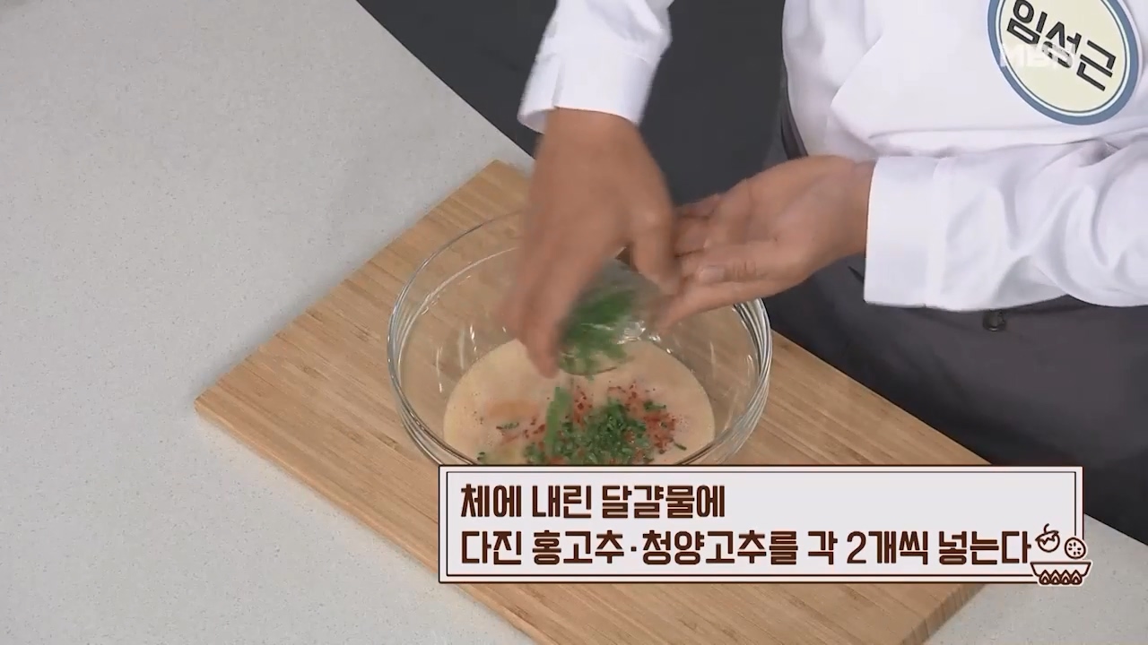 6. 체에 내린 달걀물에 다진 홍고추 2개, 다진 청양고추 2개를 넣습니다.