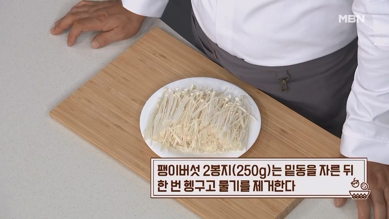 1. 팽이버섯 2봉지 (250g)는 밑동을 자른 뒤 한번 헹구고 물기를 제거합니다.