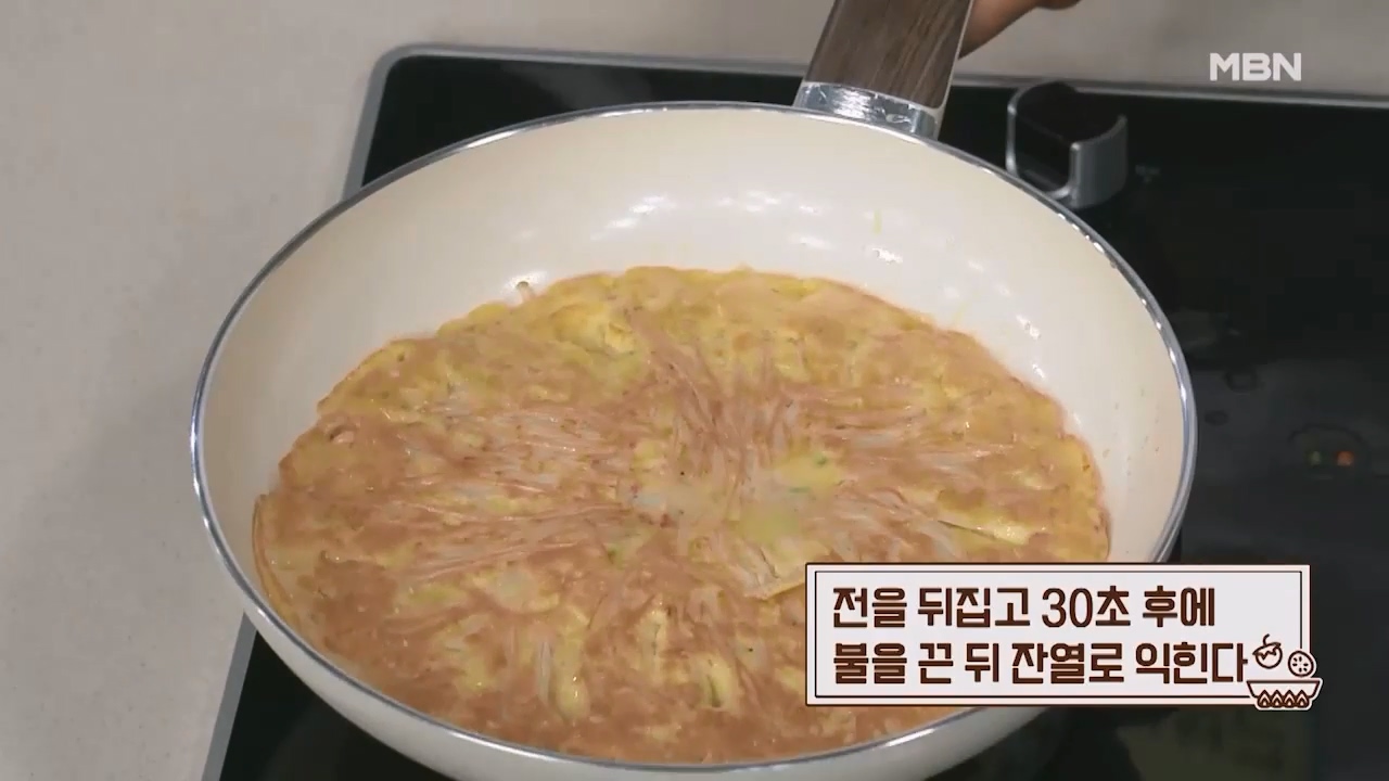12. 전을 뒤집고 30초 후에 불을 끈 뒤 잔열로 팽이버섯전을 익혀줍니다.