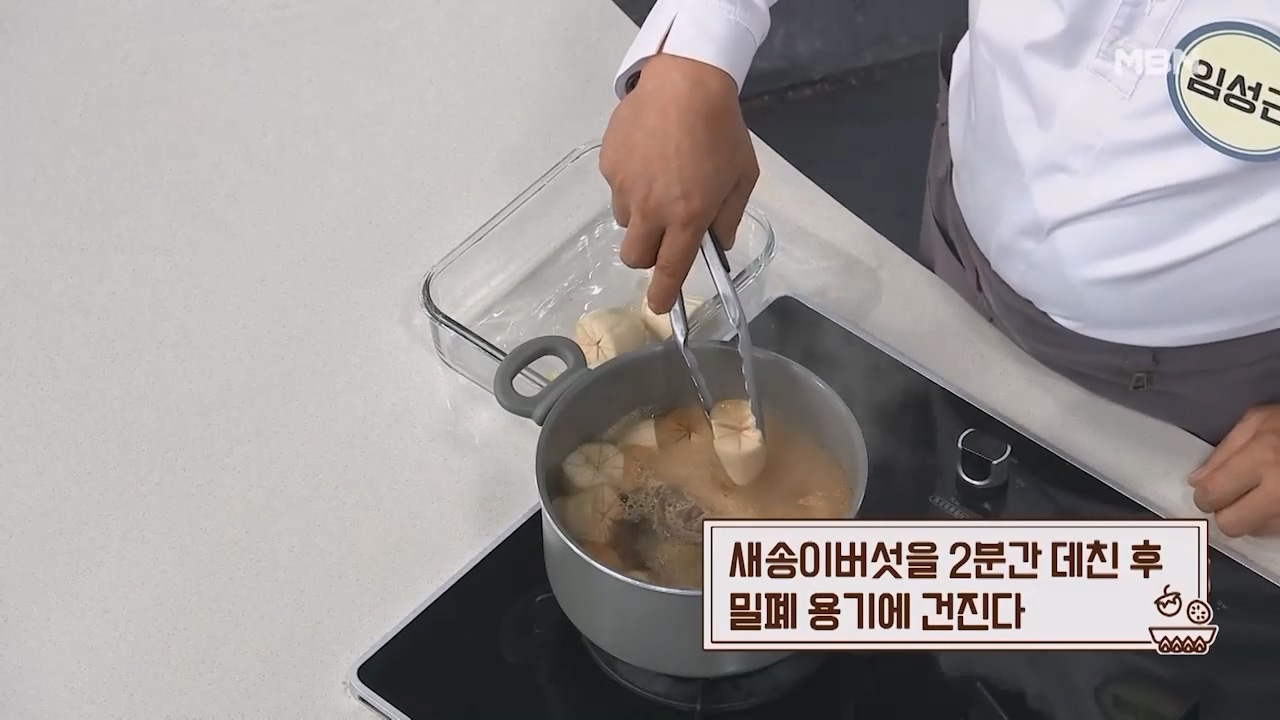 10. 새송이버섯을 2분간 데친 후 밀폐 용기에 넣습니다.