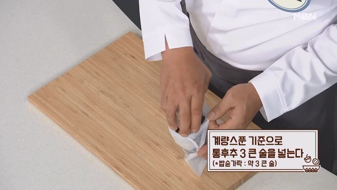 6. 육수팩에 건고추 3개, 편 썬 생강 1개 (25g)를 넣습니다.