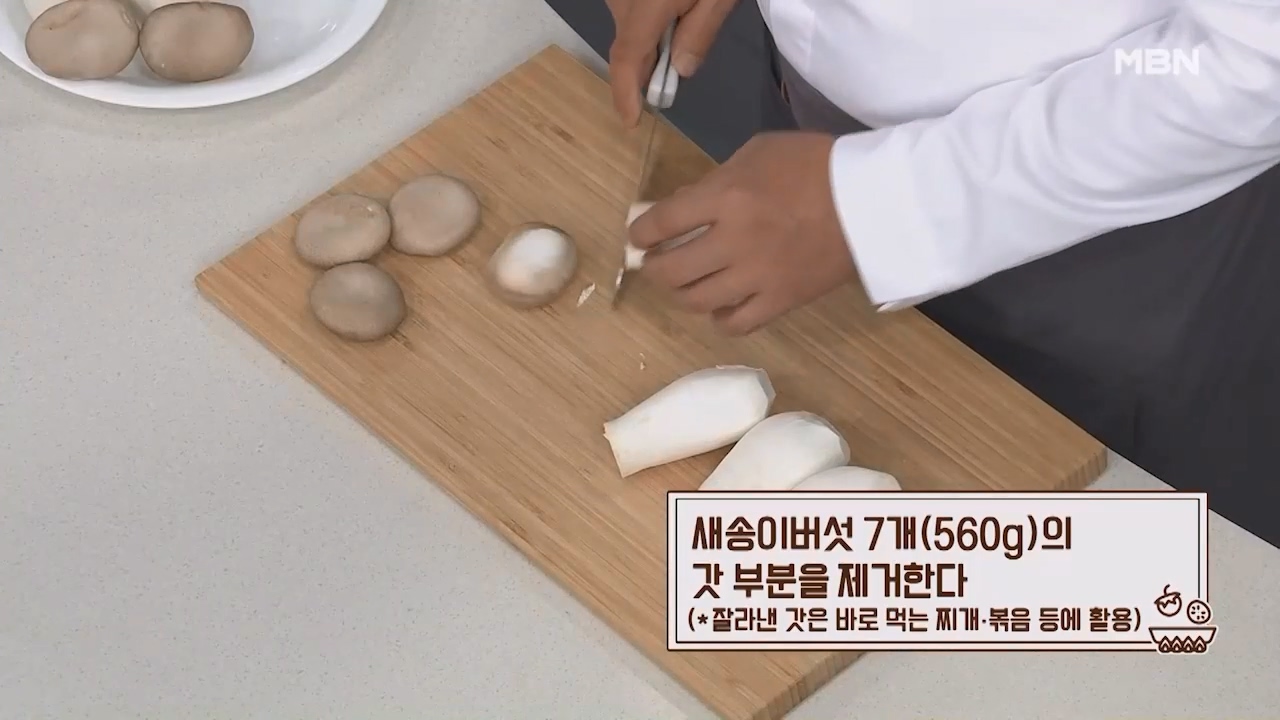 1. 새송이버섯 7개 (560g)의 갓 부분을 제거합니다. (잘라낸 새송이버섯 갓은 바로 먹는 찌개나 볶음 등에 활용하면 좋습니다.)