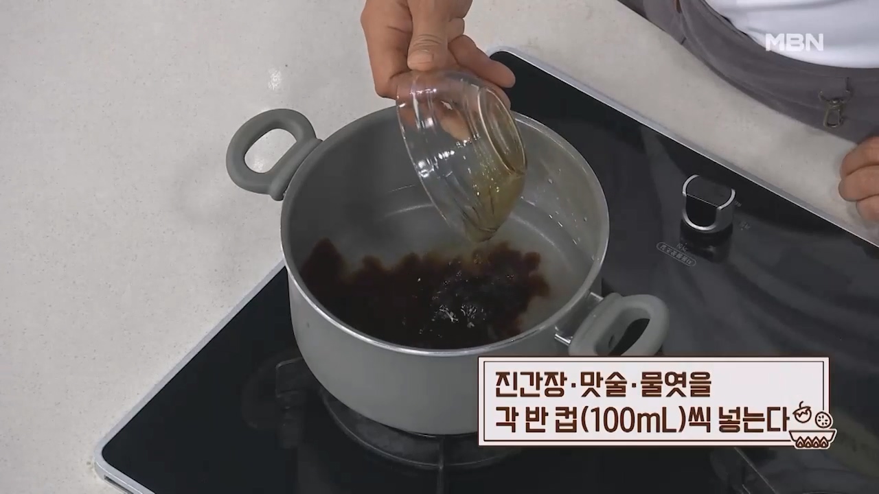 5. 진간장 반컵 (100mL), 맛술 반컵 (100mL), 물엿 반컵 (100mL)을 냄비에 넣습니다.