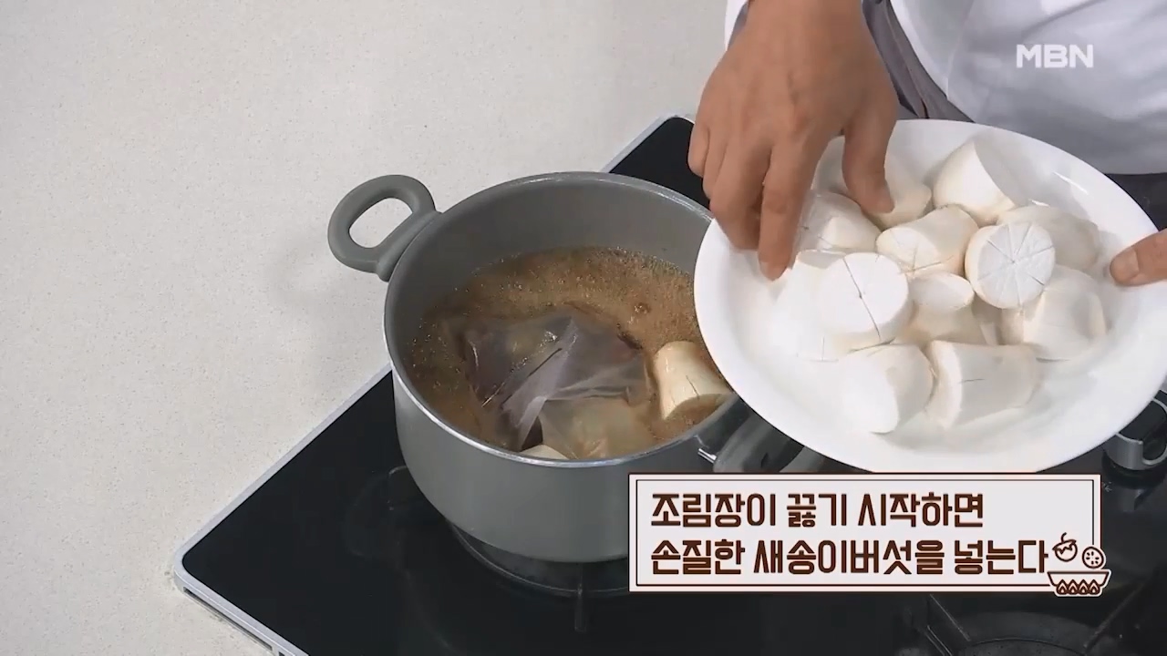 9. 조림장이 끓기 시작하면 손질한 새송이버섯을 넣습니다.