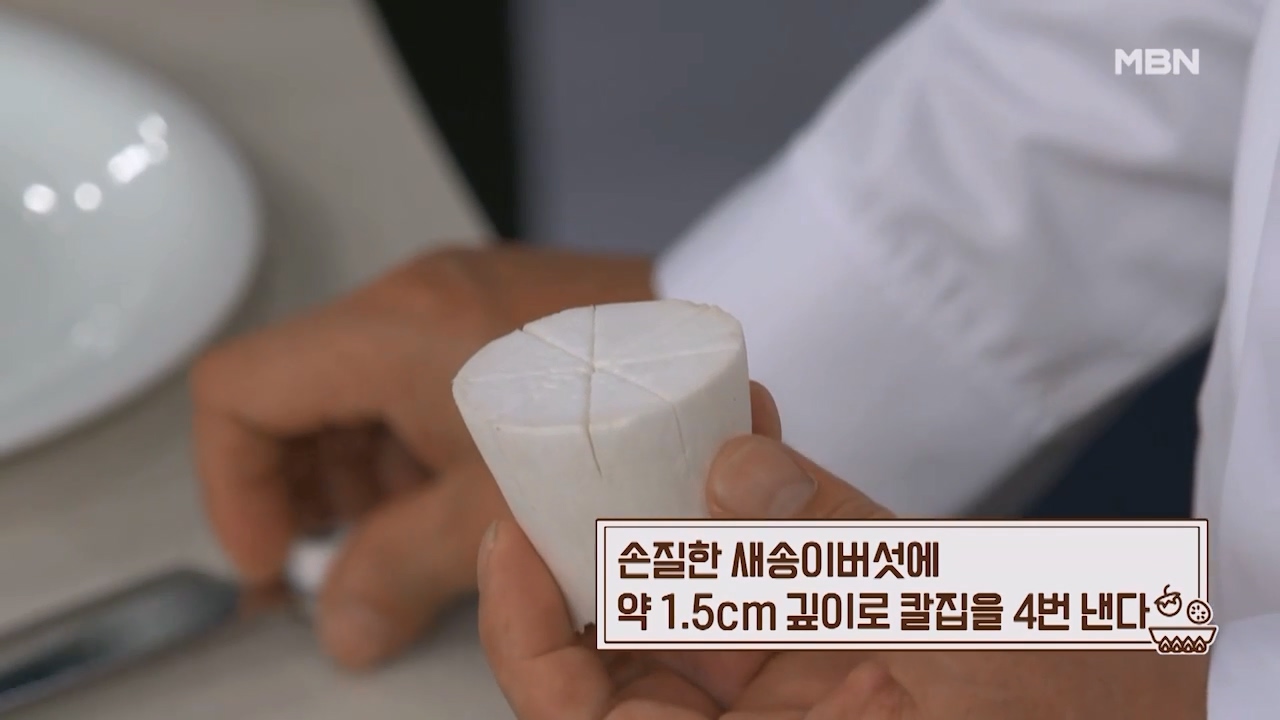 3. 손질한 새송이버섯에 약 1.5cm 깊이로 칼집을 4번 냅니다.
