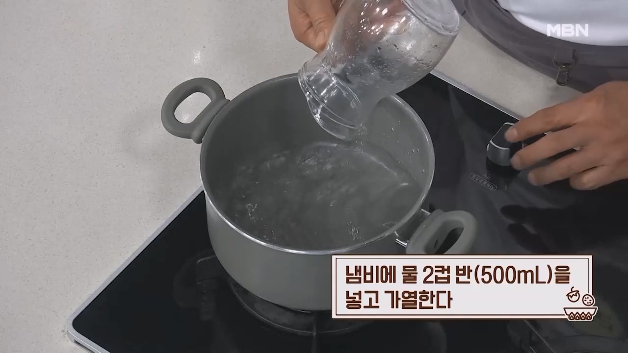 4. 냄비에 물 2컵 반 (500mL)을 넣고 가열합니다.