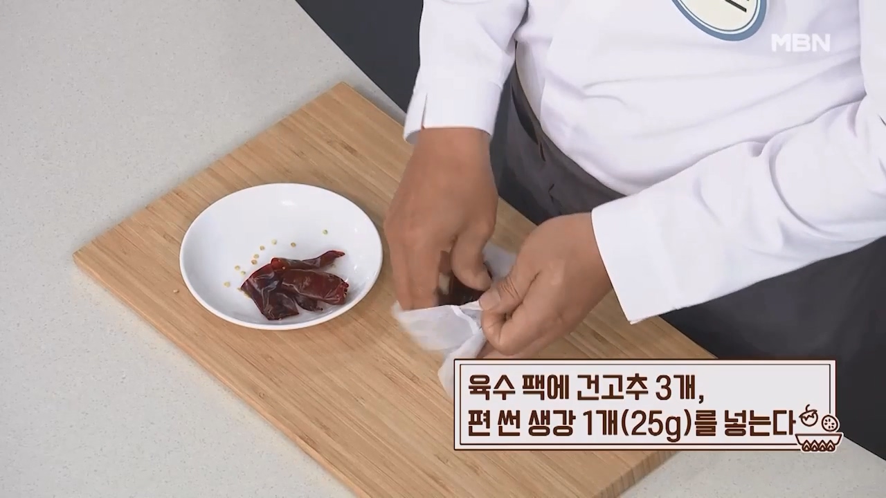 6. 육수팩에 건고추 3개, 편 썬 생강 1개 (25g)를 넣습니다.