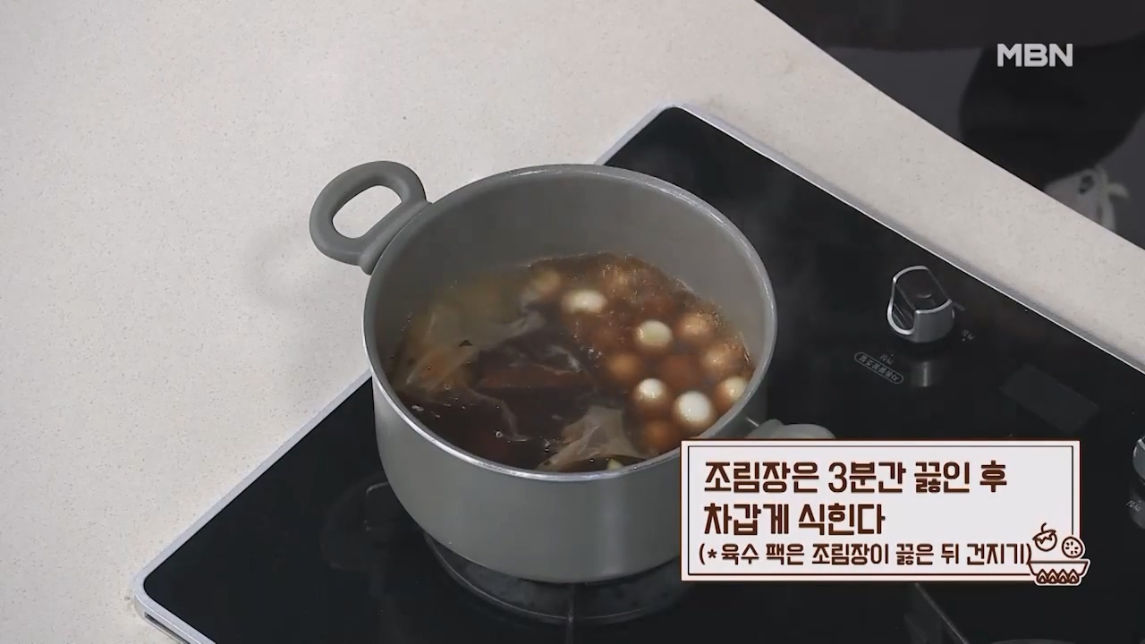 12. 조림장은 3분간 끓인 후 차갑게 식힙니다. (육수팩은 조림장이 끓은 뒤 건져줍니다.)
