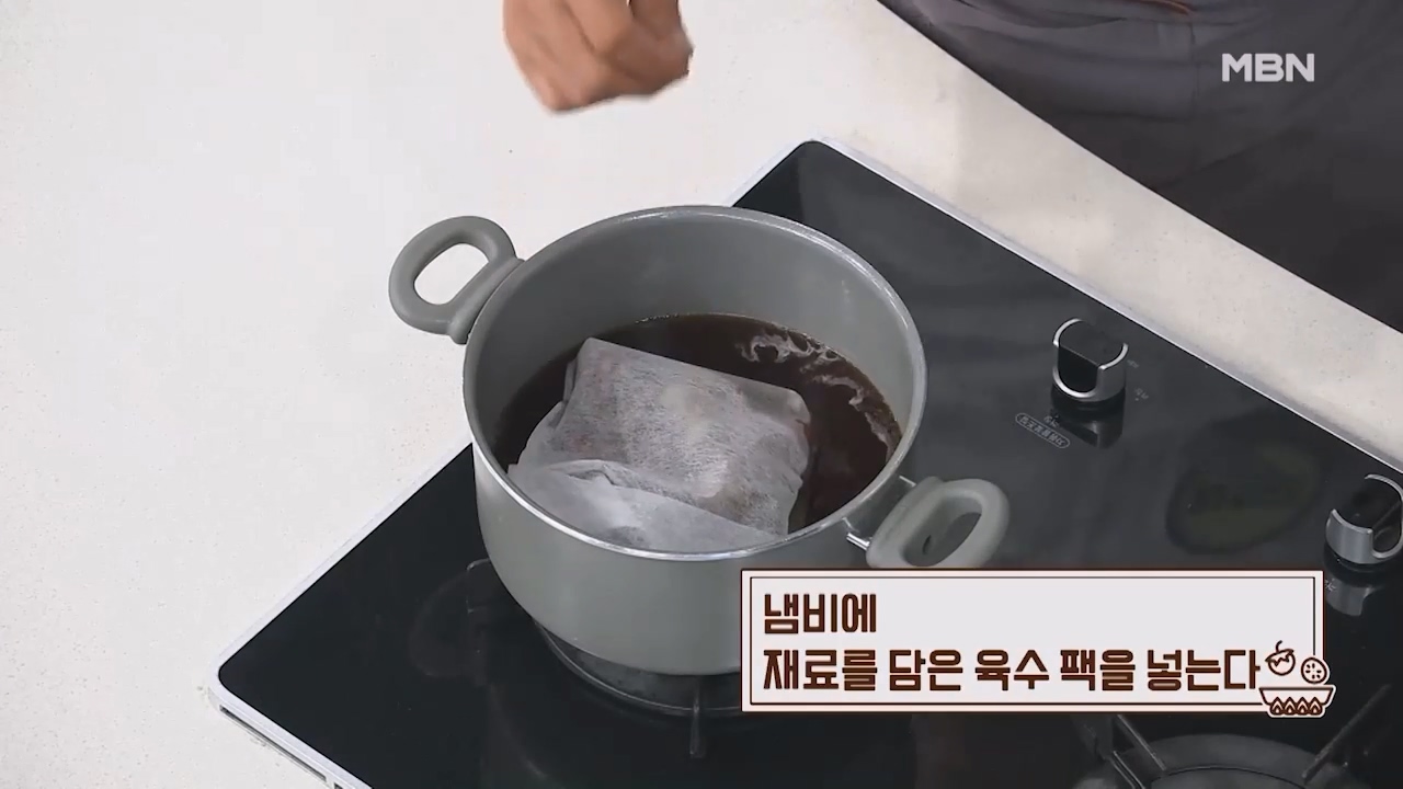 8. 냄비에 재료를 담은 육수 팩을 넣습니다.