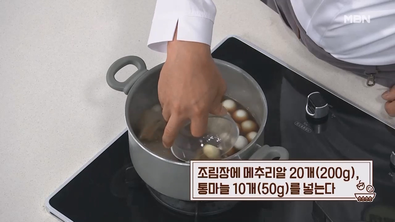 11. 조림장에 메추리알 20개 (200g), 통마늘 10개 (50g)를 넣습니다.