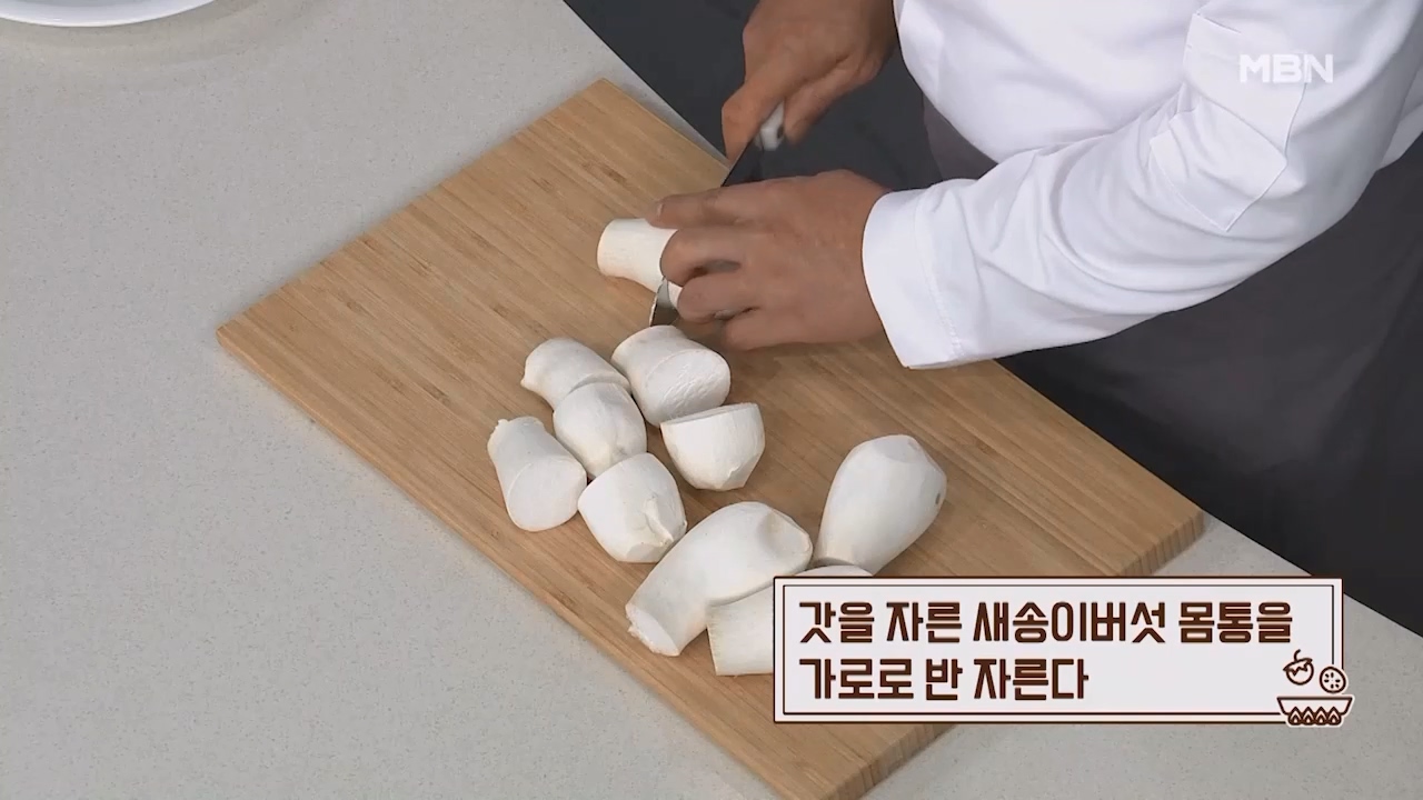 2. 갓을 자른 새송이버섯 몸통을 가로로 반을 자릅니다.