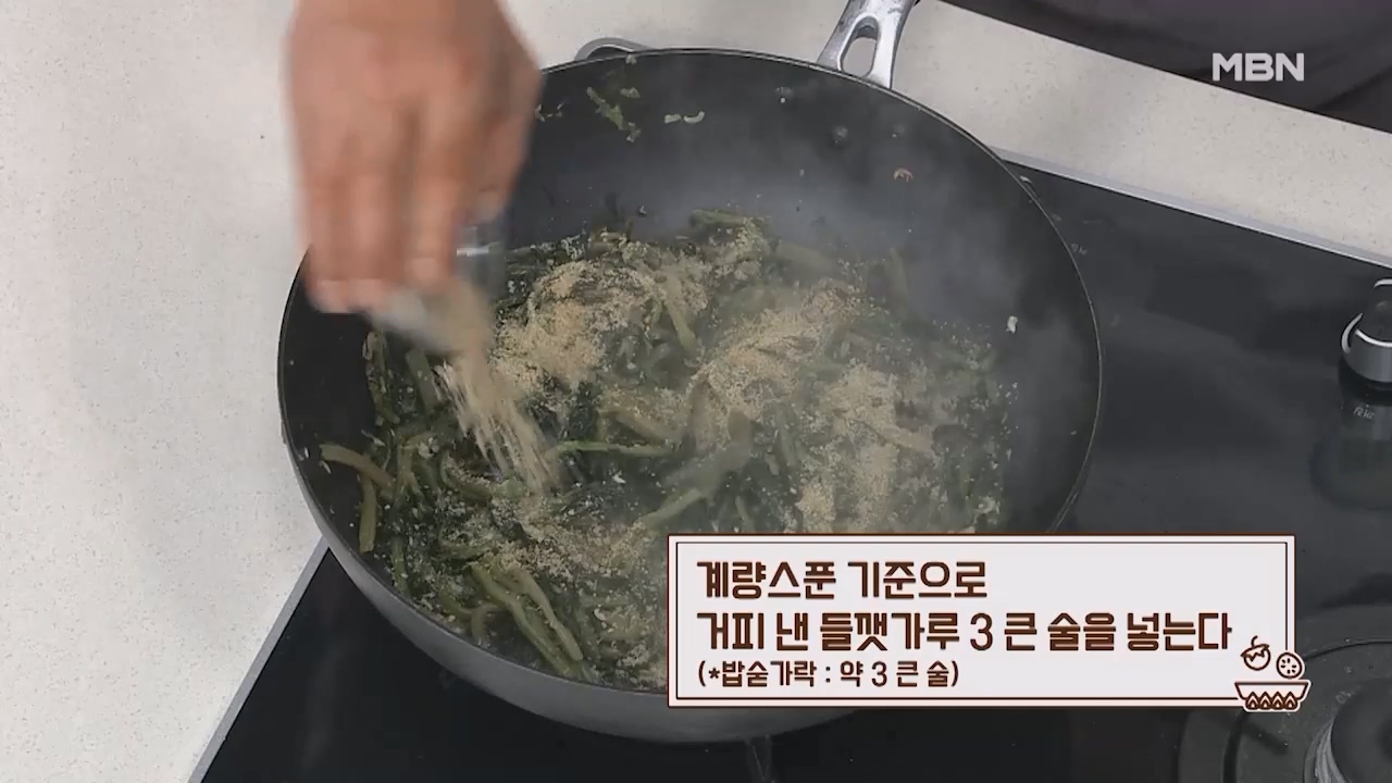 10. 시래기나물볶음에 계량스푼 기준으로 거피 낸 들깻가루 3큰술을 넣습니다. (밥숟가락 약 3큰술)