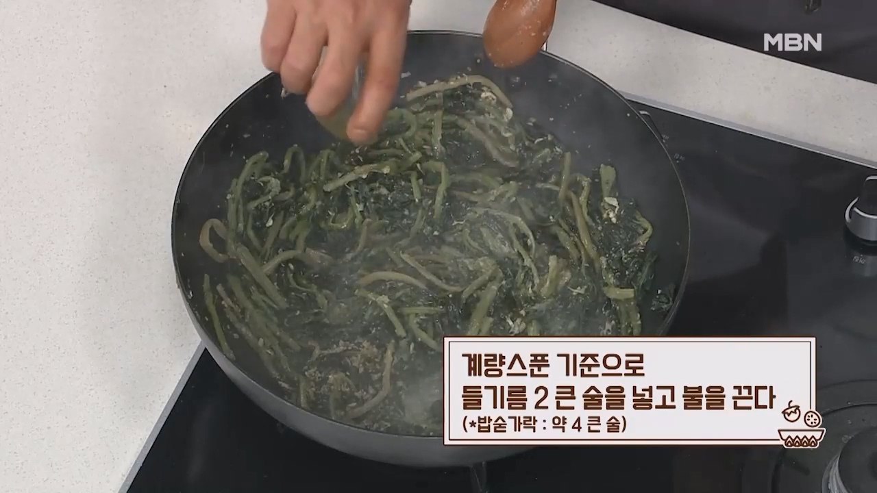 11. 계량스푼 기준으로 들기름 2큰술을 넣고 불을 끄고 식히면 맛있는 시래기나물볶음이 완성됩니다. (밥숟가락 약 4큰술)