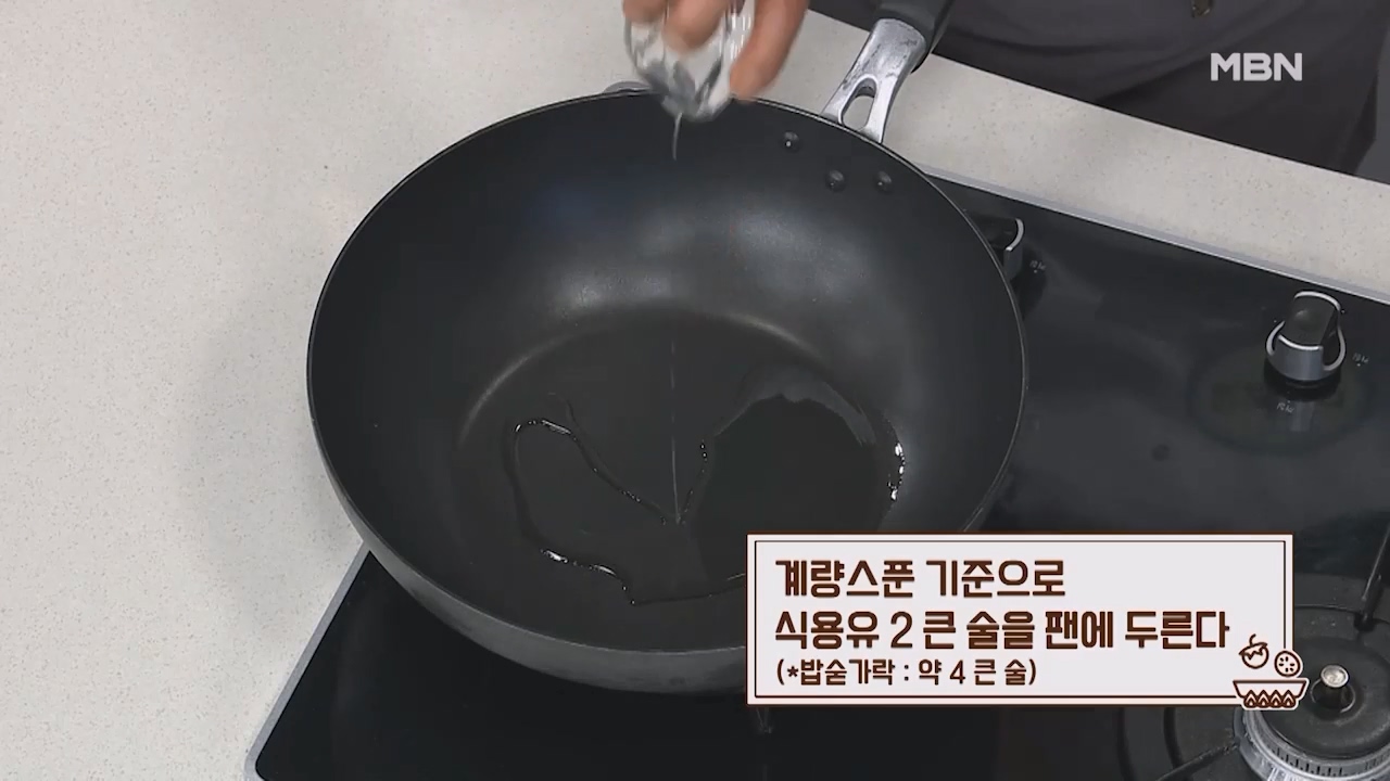 6. 계량스푼 기준으로 식용유 2큰술을 팬에 두릅니다. (밥숟가락 약 4큰술)