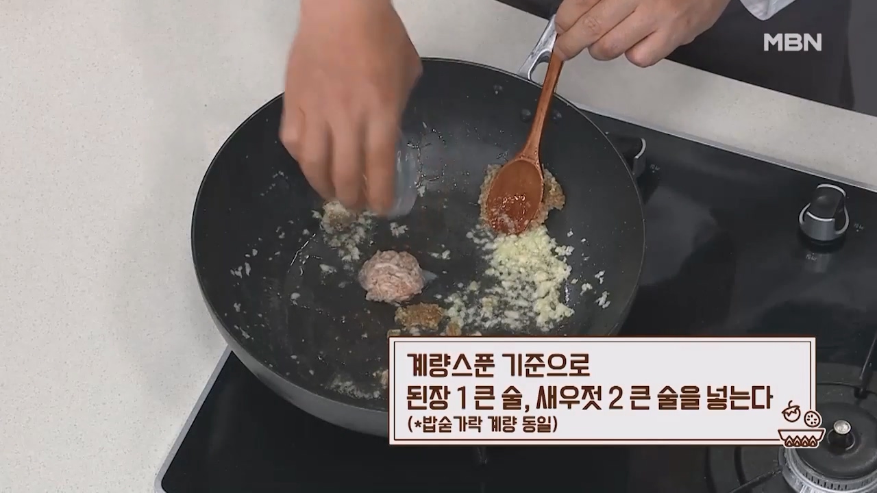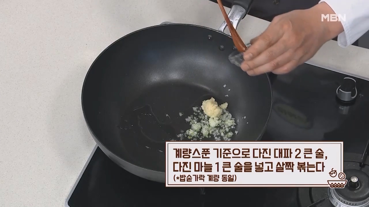 7. 계량스푼 기준으로 다진 대파 2큰술, 다진 마늘 1큰술을 넣고 살짝 볶아줍니다. (밥숟가락 계량 동일)