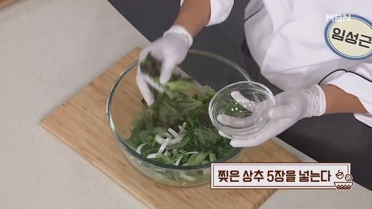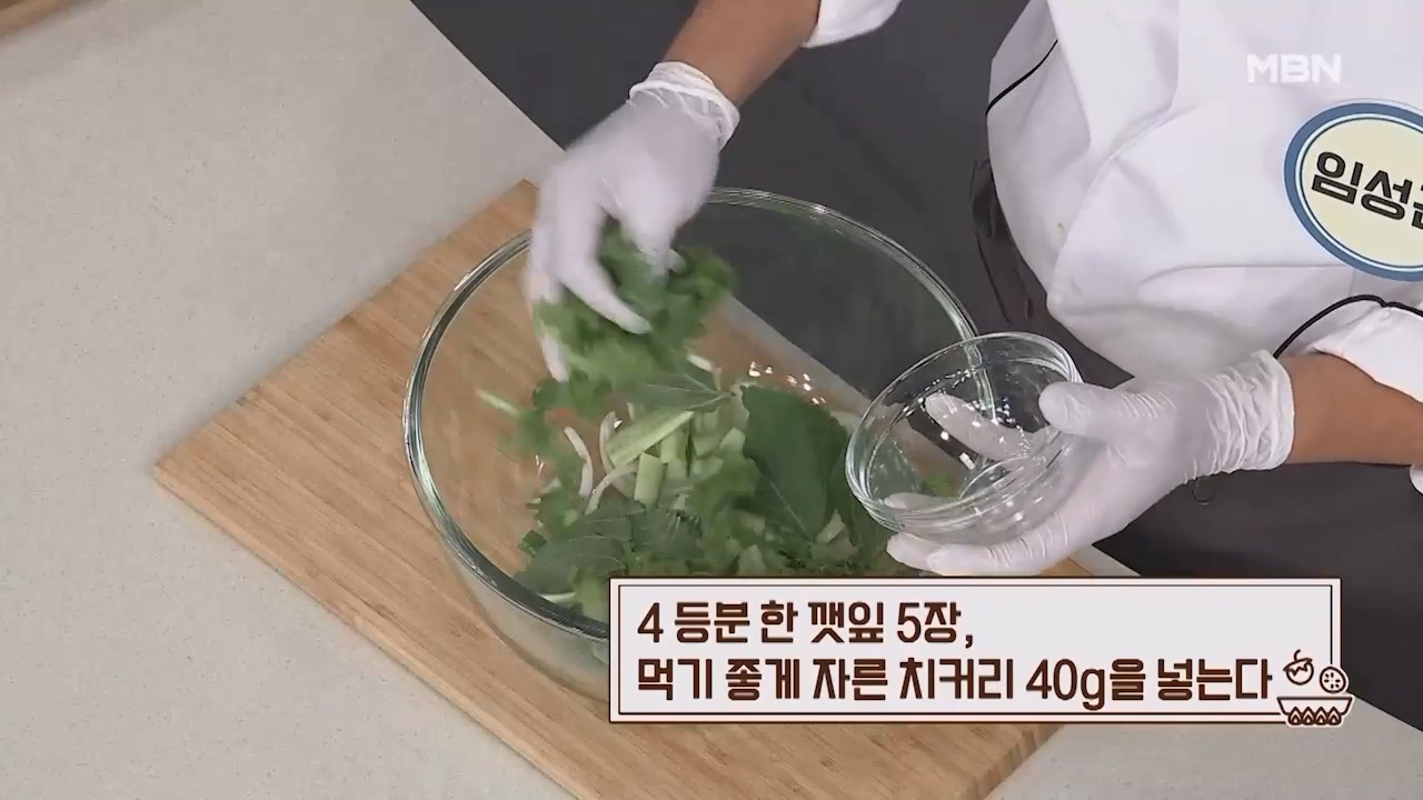 9. 4등분 한 깻잎 5장 먹기 좋게 자른 치커리 40g을 넣습니다.