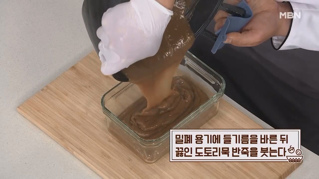 6. 밀폐 용기에 들기름을 바른 뒤 끓인 도토리묵 반죽을 부어줍니다.