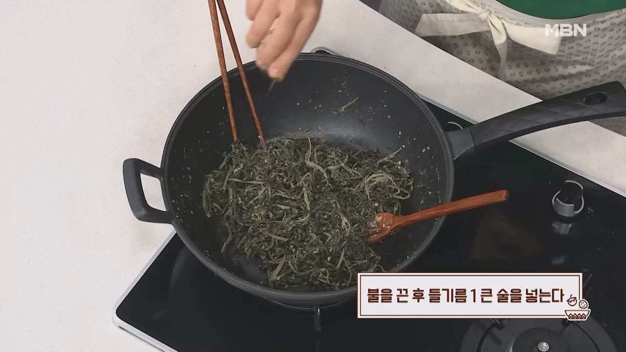 11. 불을 끈 후 들기름 1큰술을 넣고 잘 섞어주면 맛있는 취나물볶음이 완성됩니다.
