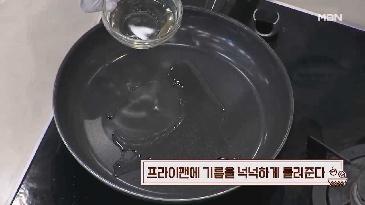 10. 프라이팬에 기름을 넉넉하게 둘러줍니다.