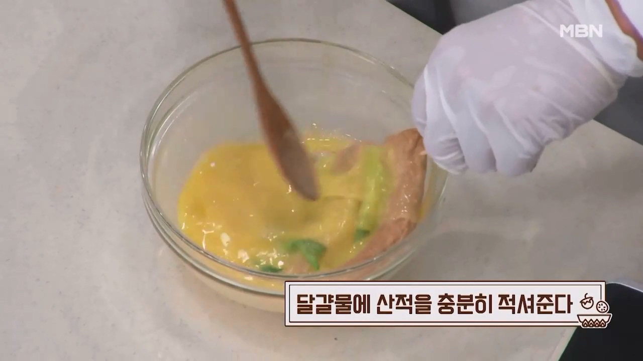 11. 달걀물에 산적을 충분히 적셔줍니다.
