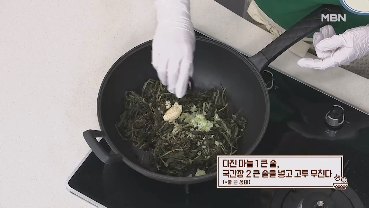 7. 불을 끈 상태에서 다진 마늘 1큰술, 국간장 2큰술을 넣고 취나물을 무쳐줍니다.
