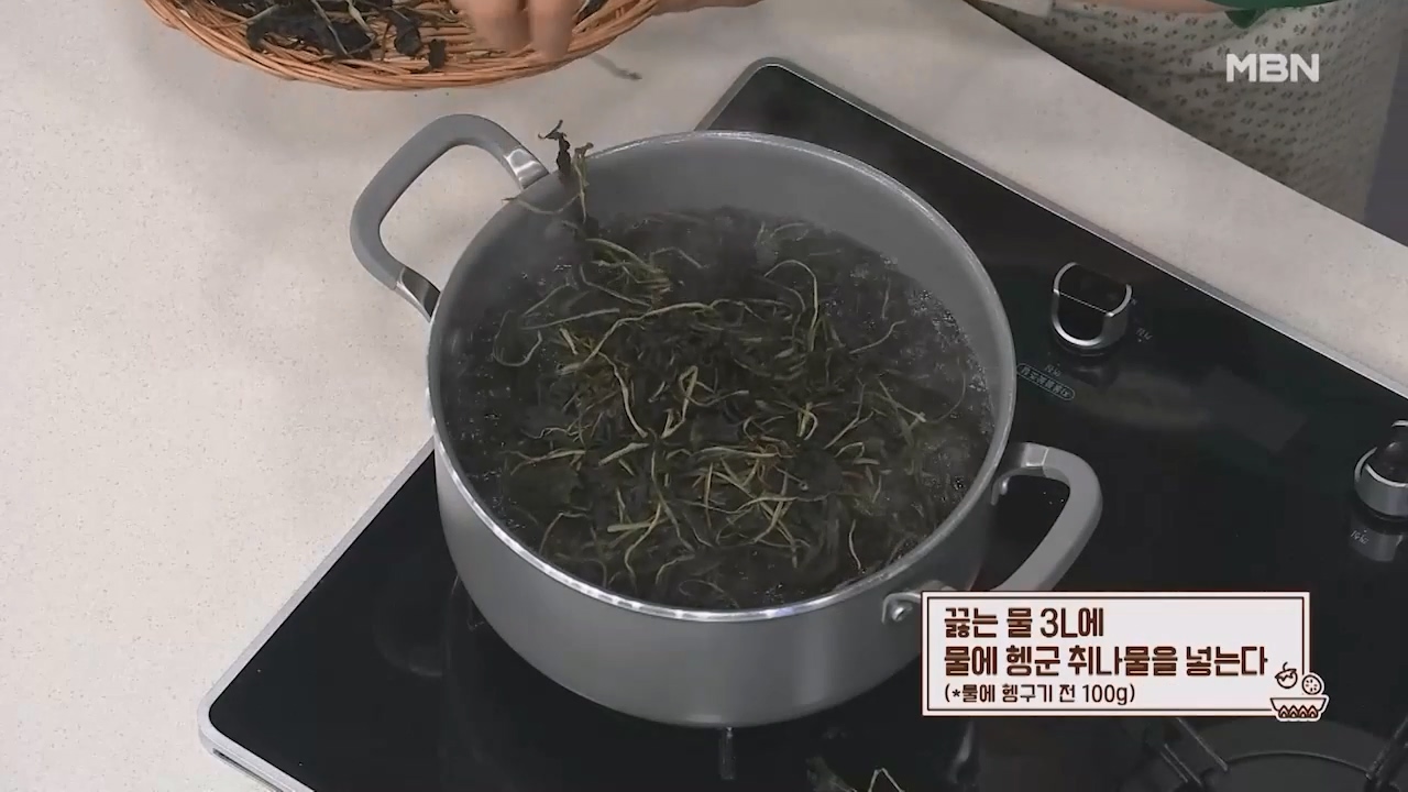 1. 끓는 물 3리터에 물에 헹군 취나물을 넣습니다. (물에 헹구기 전 취나물 100g)