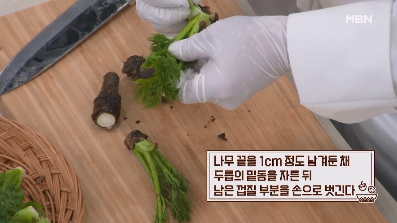 1. 나무 끝을 1cm 정도 남겨둔 채 두릅의 밑동을 자른 뒤 남은 껍질 부분을 손으로 벗깁니다.