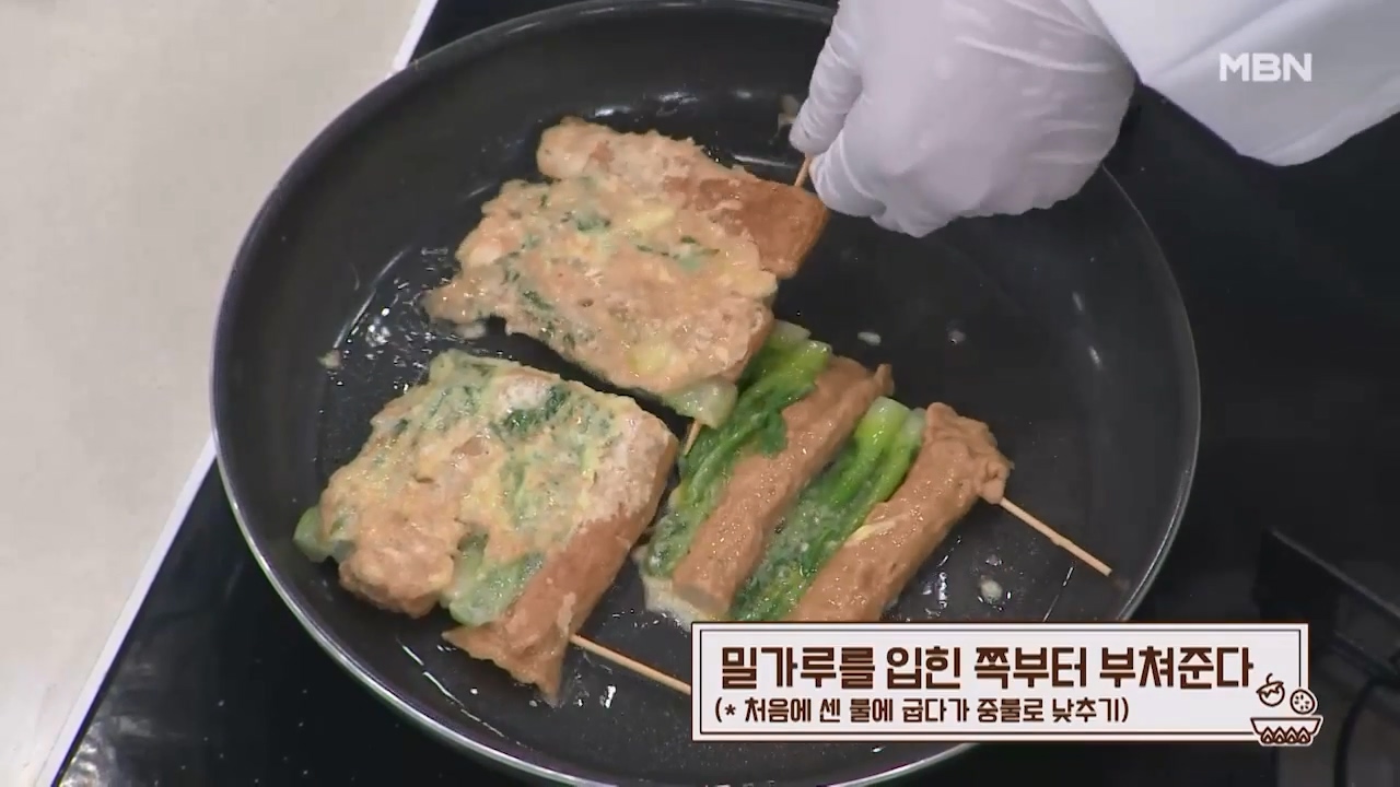 12. 밀가루를 입힌 쪽부터 부쳐주면 어묵산적이 완성됩니다. (처음에 센불로 굽다가 중불로 낮춥니다.)