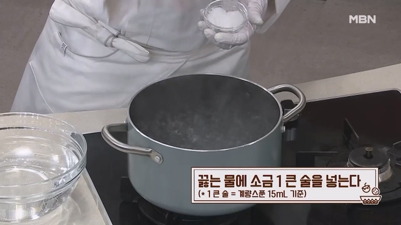 3. 끓는 물에 소금 1큰술을 넣습니다. (1큰술은 계량스푼 15mL 기준)