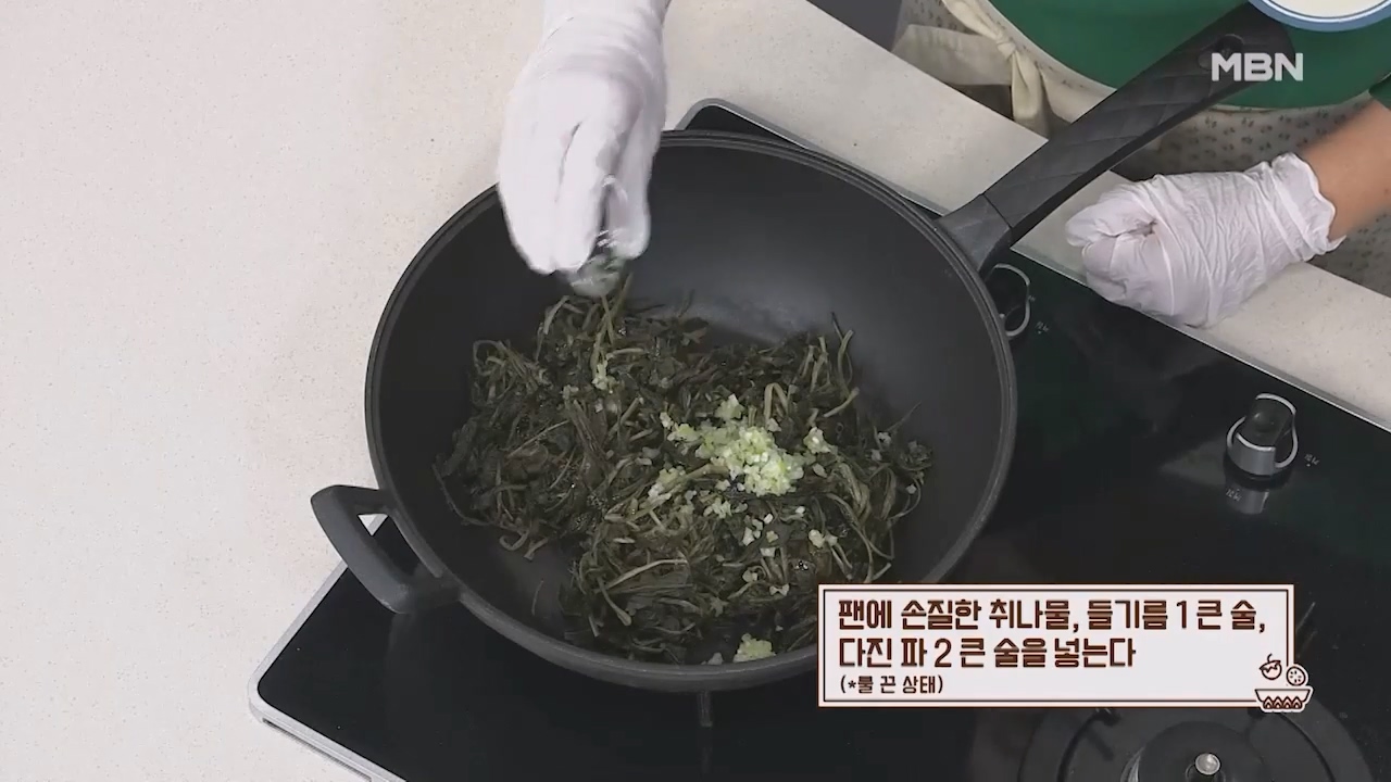 6. 불을 끈 상태에서 후라이팬에 손질한 취나물을 넣고 들기름 1큰술, 다진 파 2큰술을 넣습니다.