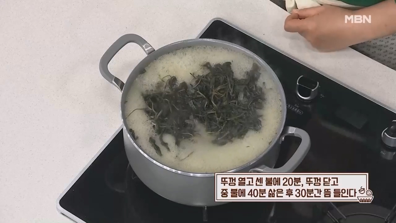 3. 뚜껑을 열고 센불에서 20분 냄비 뚜껑을 닫고 중불에 40분 삶은 후 30분간 뜸을 들입니다.